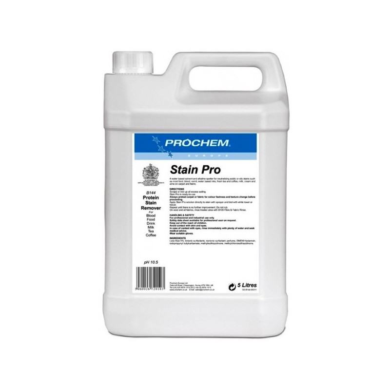 STAIN PRO to silny profesjonalny odplamiacz zasadowy do usuwania zabrudzeń białkowych z krwi, wymiocin, atramentów wodnych (tuszy), świeżych plam z kawy i herbaty, mleka, śmietany, wina i większości zabrudzeń spożywczych