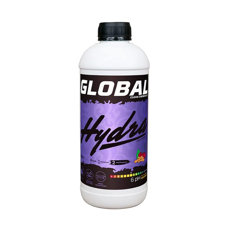 GLOBAL Hydra to innowacyjny środek do płukania ekstrakcyjnego tapicerki, stworzony dla tych, którzy chcą połączyć maksymalną skuteczność czyszczenia z wyjątkowo trwałym, przyjemnym zapachem. Hydra wykorzystuje nadtlenek wodoru w nowoczesnej formie, dzięki czemu nie tylko wypłukuje resztki detergentu, ale też aktywnie neutralizuje nieprzyjemne zapachy, których standardowe płukania nie są w stanie usunąć. Jego zadaniem jest dokładne wypłukanie wszelkich pozostałości po czyszczeniu wstępnym, takich jak tłuszcz, smar, żywność, kosmetyki, plamy z kawy i plamy z krwi oraz skuteczna neutralizacja nieprzyjemnych zapachów. Hydra działa głęboko, przywracając tkaninom czystość, świeżość i naturalną miękkość.